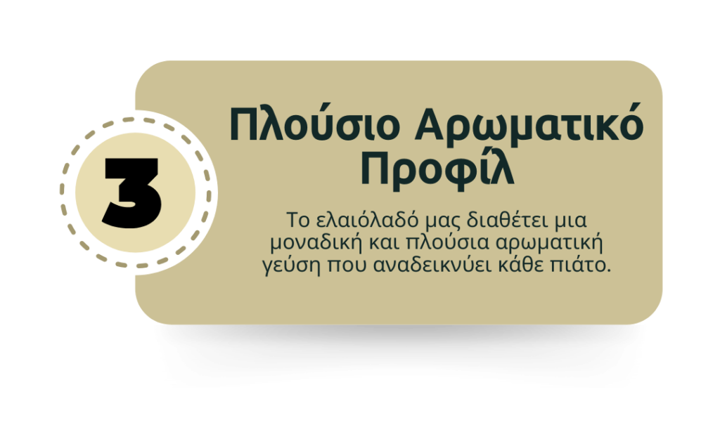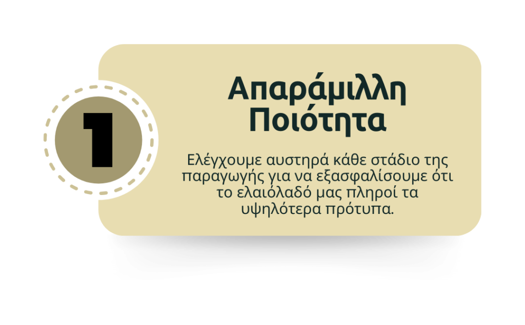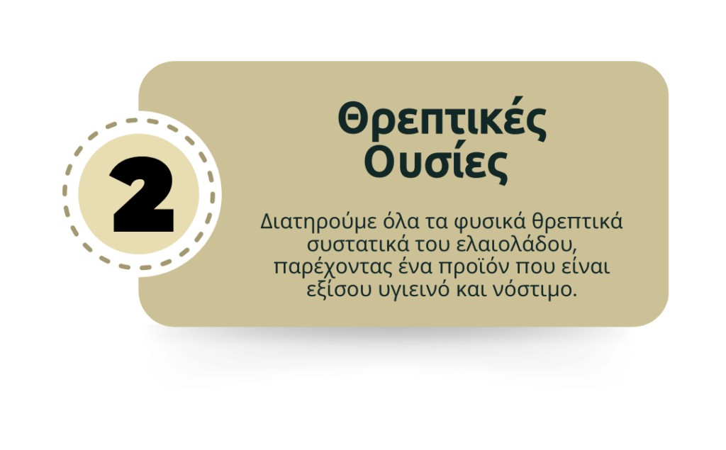 Oiling is carried out exclusively by mechanical means, without the addition of water. We use the cold pressing method to ensure that the olive oil retains all its nutrients and rich aromas. This process protects the valuable phenols and monounsaturated fats, providing a superior in quality olive oil. Finally, it is immediately filtered and stored in stainless steel tanks with the addition of nitrogen, in order to keep all its organoleptic components intact, as confirmed by our product quality certificates.